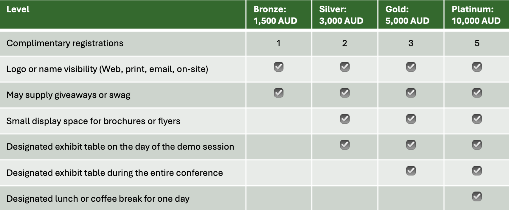Depending on the level, a patron can receive additional benefits as shown below. Alternatively, a patron may choose to sponsor specific events and activities, e.g., student registration and/or travel grants, coffee breaks, lunch, reception, or conference banquet, or offer an in-kind contribution.