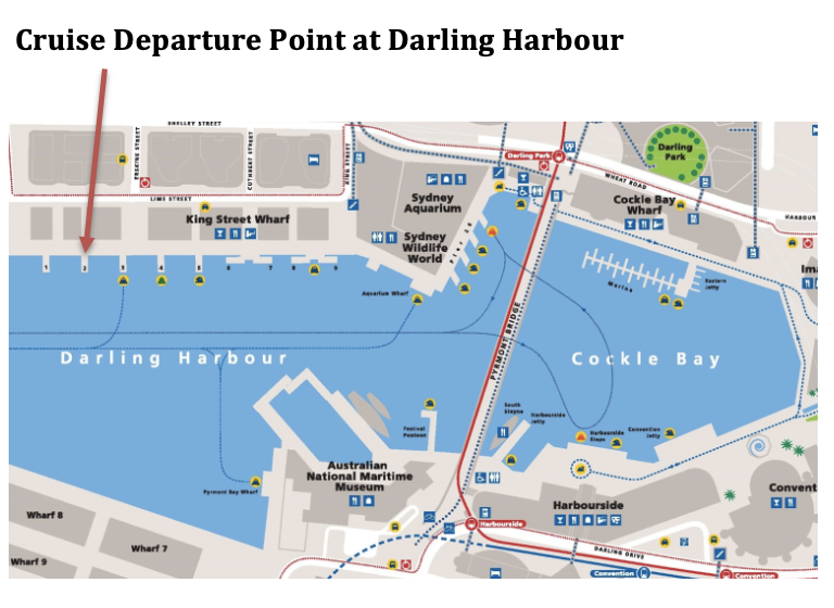 We will board the Captain Cook III cruise boat from No. 2, King Street Wharf. See the provided map on the back of this page.