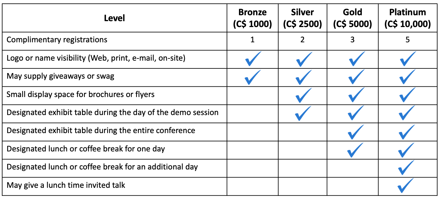 Depending on the level, a patron can receive additional benefits as shown below. Alternatively, a patron may choose to sponsor specific events and activities, e.g., student registration and/or travel grants, coffee breaks, lunch, reception, or conference banquet, or offer an in-kind contribution.